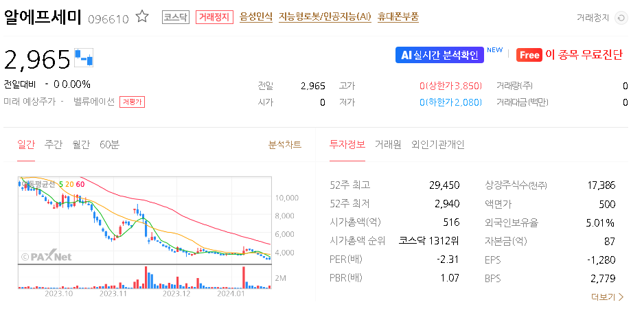 외국인 보유 비중은 5.01% 이며 장중 거래량은 0원 을 기록했습니다. 매출액은 202억 원을 달성했습니다. EPS는 없음원이며 알에프세미 주식 배당수익률은 -110% 입니다.