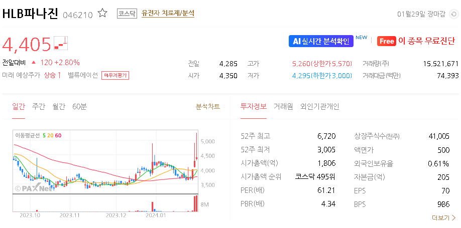 외국인 보유 비중은 0.61% 이며 장중 거래량은 14,641,084원 을 기록했습니다. 매출액은 96억 원을 달성했습니다. EPS는 없음원이며 HLB파나진 주식 배당수익률은 % 입니다.