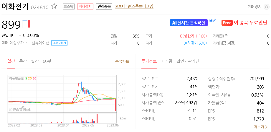 외국인 보유 비중은 0.95% 이며 장중 거래량은 0원 을 기록했습니다. 매출액은 363억 원을 달성했습니다. EPS는 없음원이며 이화전기 주식 배당수익률은 % 입니다.