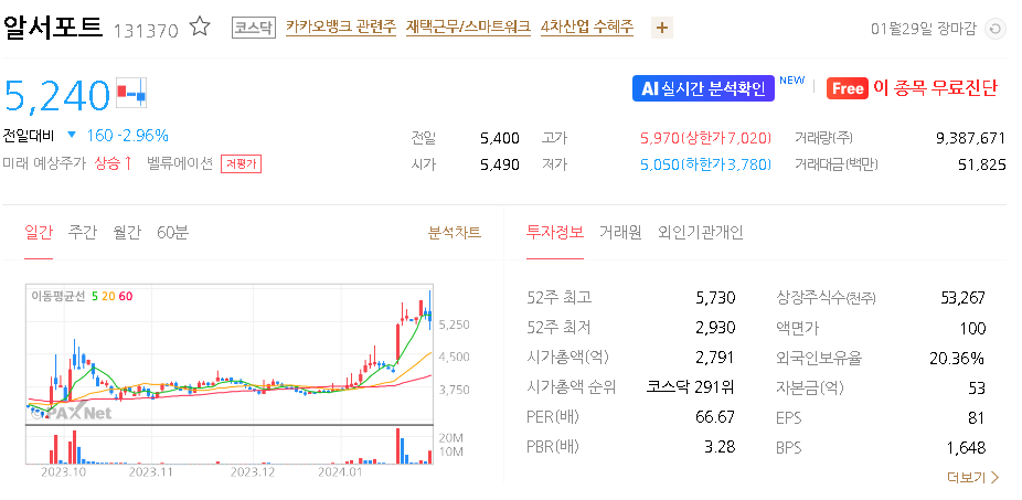 외국인 보유 비중은 20.36% 이며 장중 거래량은 2,019,072원 을 기록했습니다. 매출액은 360억 원을 달성했습니다. EPS는 없음원이며 알서포트 주식 배당수익률은 0.64% 입니다.