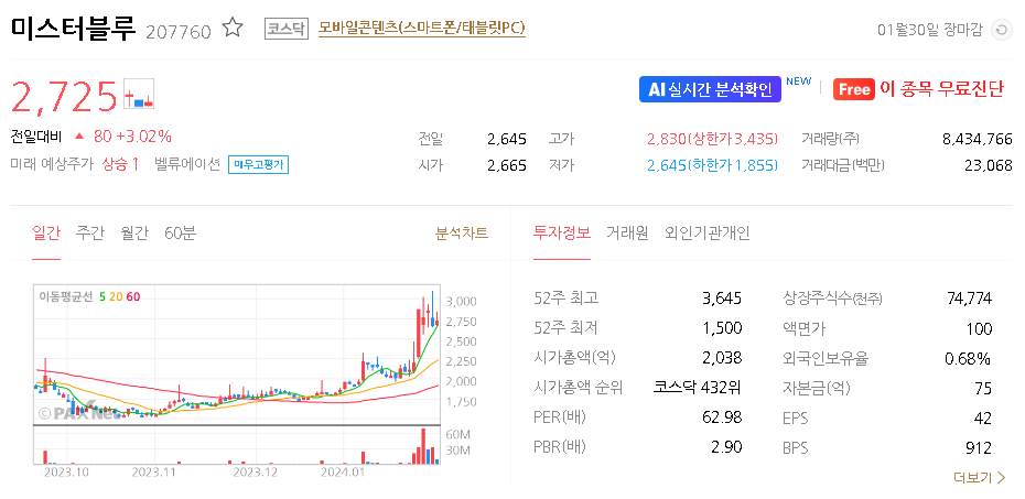 미스터블루 주가 분석
