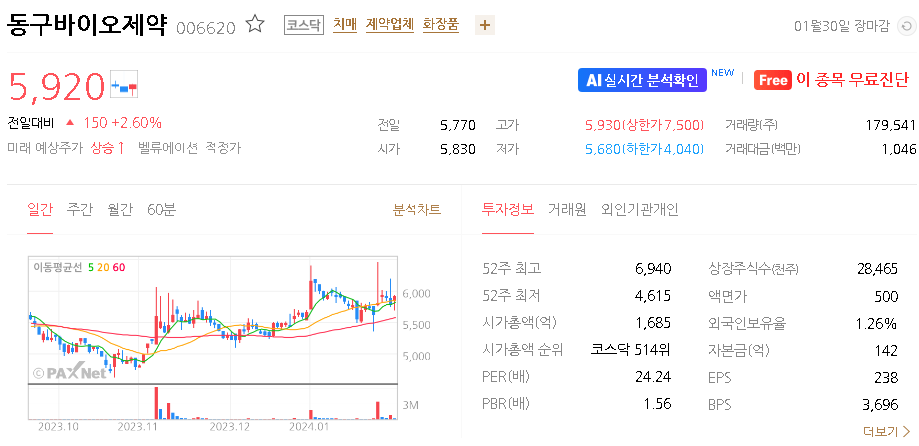외국인 보유 비중은 1.26% 이며 장중 거래량은 724,610원 을 기록했습니다. 매출액은 1,537억 원을 달성했습니다. EPS는 없음원이며 동구바이오제약 주식 배당수익률은 1.00% 입니다.