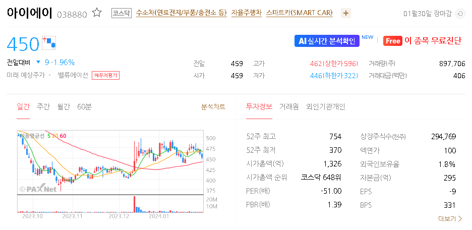 외국인 보유 비중은 1.80% 이며 장중 거래량은 841,786원 을 기록했습니다. 매출액은 471억 원을 달성했습니다. EPS는 없음원이며 아이에이 주식 배당수익률은 156% 입니다.