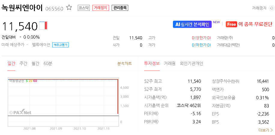 외국인 보유 비중은 0.31% 이며 장중 거래량은 0원 을 기록했습니다. 매출액은 131억 원을 달성했습니다. EPS는 없음원이며 녹원씨엔아이 주식 배당수익률은 % 입니다.