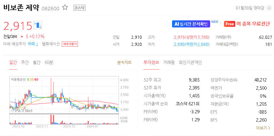 이 글에서는 비보존 제약 주가 전망과 목표 주가, 기업 정보에 대해서 설명합니다. 주식 거래에서 중요한 부분은 현재 기업 가치보다는 미래의 기업 가치를 예측하고 먼저 행동하는 것입니다. 투자할 종목을 고르기 전에 현재 기업의 상황과 지표를 살펴보는 것이 중요합니다. 비보존 제약 주식의 주요 현황과 투자 정보를 확인하시고 주식 투자에 도움을 줄 자료들을 모아 두었으니 투자에 도움을 받으시길 바랍니다.