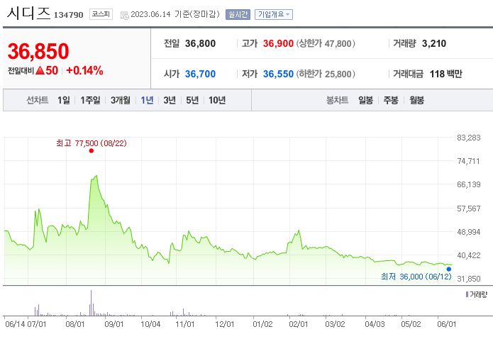 시디즈 현재 주가는 36,850원이며 전일 대비 -150원의 모습을 보이고 있습니다. 시디즈의 주주현황을 살펴보면 일룸(외 2인)이 지분 58.73%를 소유하고 있습니다. 시디즈는 내구소비재 기업으로 장중 기준으로 주가는 36,850원입니다. 시디즈의 시가 총액은 736억 원이며 발행 주식수는 1.15주입니다.