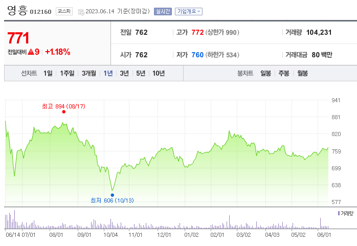 외국인 보유 비중은 107,214% 이며 장중 거래량은 101,310,372를 기록했습니다. 매출액은 1,232억 원, 영업이익은 42억 원을 달성했습니다. EPS는 없음원이며 영흥 주식 배당수익률은 3.45%입니다.