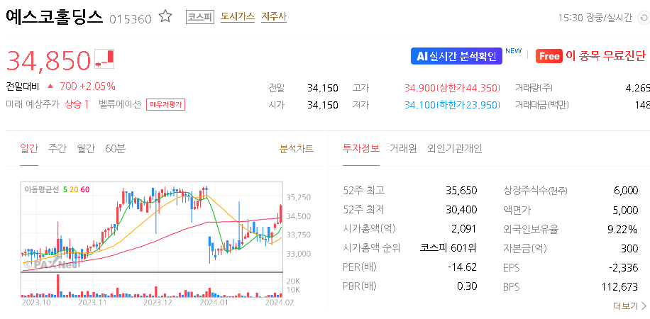 외국인 보유 비중은 9.21% 이며 장중 거래량은 4,945원 을 기록했습니다. 매출액은 10,071억 원을 달성했습니다. EPS는 없음원이며 예스코홀딩스 주식 배당수익률은 5.40% 입니다.