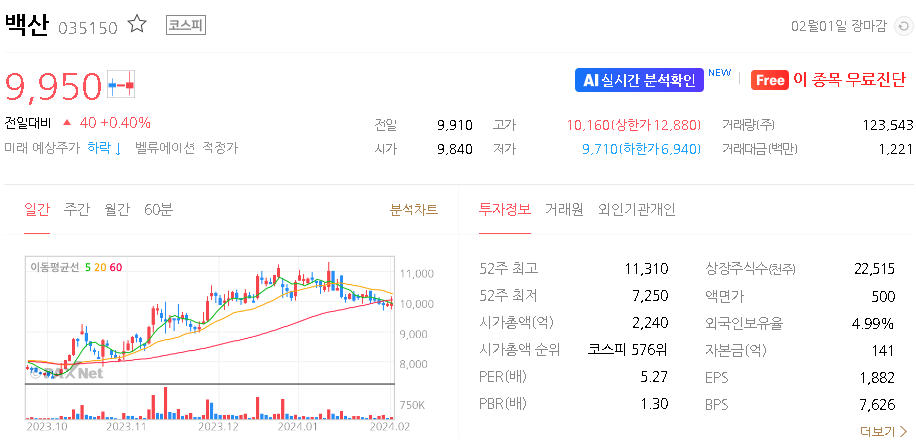 외국인 보유 비중은 4.95% 이며 장중 거래량은 196,897원 을 기록했습니다. 매출액은 3,176억 원을 달성했습니다. EPS는 1,950원이며 백산 주식 배당수익률은 1,796,323% 입니다.