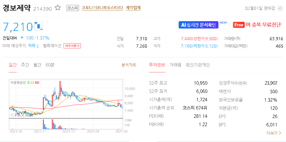 외국인 보유 비중은 1.31% 이며 장중 거래량은 66,697원 을 기록했습니다. 매출액은 1,551억 원을 달성했습니다. EPS는 없음원이며 경보제약 주식 배당수익률은 0.42% 입니다.