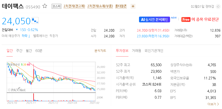 외국인 보유 비중은 11.16% 이며 장중 거래량은 10,387원 을 기록했습니다. 매출액은 1,108억 원을 달성했습니다. EPS는 없음원이며 테이팩스 주식 배당수익률은 1.23% 입니다.