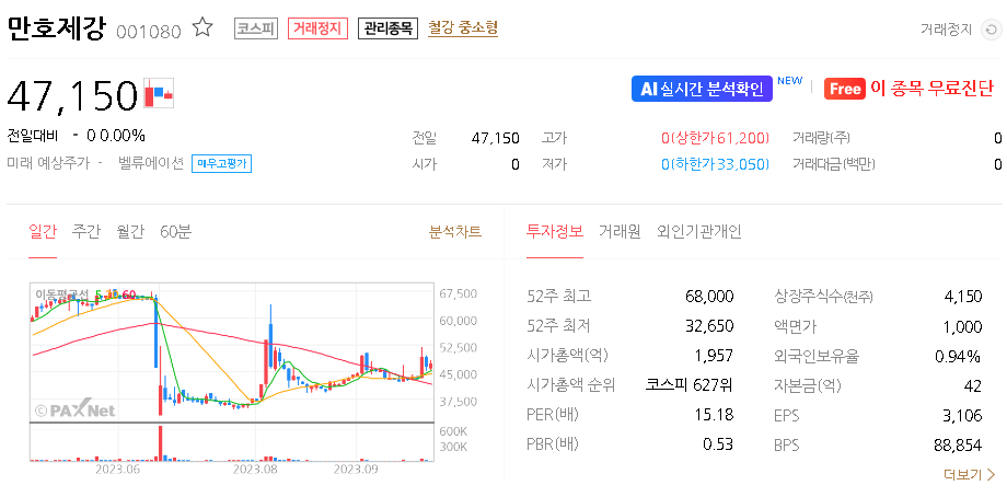 외국인 보유 비중은 0.94% 이며 장중 거래량은 0원 을 기록했습니다. 매출액은 378억 원을 달성했습니다. EPS는 없음원이며 만호제강 주식 배당수익률은 6.87% 입니다.