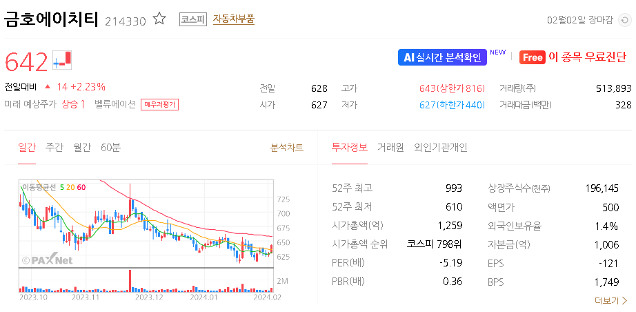 외국인 보유 비중은 1.40% 이며 장중 거래량은 208,575원 을 기록했습니다. 매출액은 2,499억 원을 달성했습니다. EPS는 없음원이며 금호에이치티 주식 배당수익률은 -6.90% 입니다.