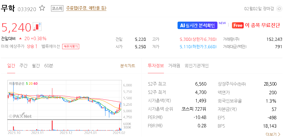 외국인 보유 비중은 1.30% 이며 장중 거래량은 222,994원 을 기록했습니다. 매출액은 1,116억 원을 달성했습니다. EPS는 없음원이며 무학 주식 배당수익률은 1.63% 입니다.