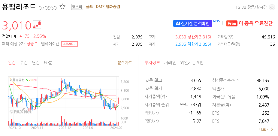 외국인 보유 비중은 1.09% 이며 장중 거래량은 39,096원 을 기록했습니다. 매출액은 1,309억 원을 달성했습니다. EPS는 -42원이며 용평리조트 주식 배당수익률은 1.03% 입니다.