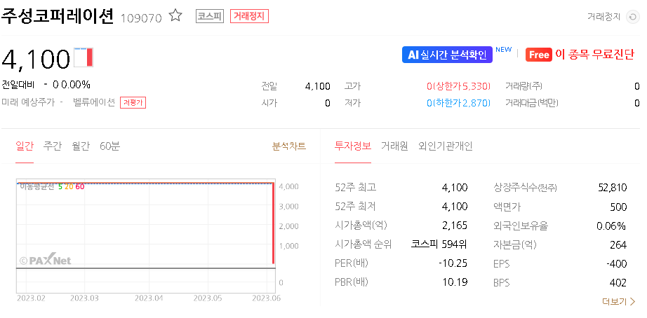 외국인 보유 비중은 0.06% 이며 장중 거래량은 0원 을 기록했습니다. 매출액은 200억 원을 달성했습니다. EPS는 없음원이며 주성코퍼레이션 주식 배당수익률은 % 입니다.
