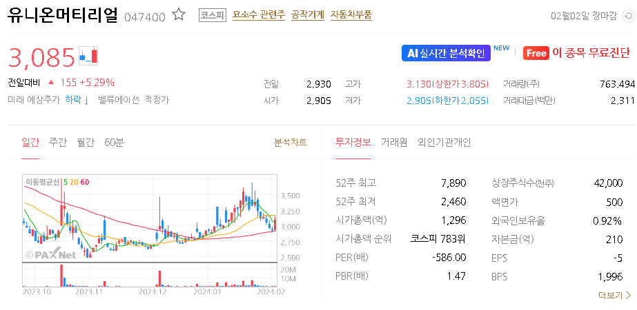 외국인 보유 비중은 0.92% 이며 장중 거래량은 473,513원 을 기록했습니다. 매출액은 893억 원을 달성했습니다. EPS는 없음원이며 유니온머티리얼 주식 배당수익률은 1.87% 입니다.