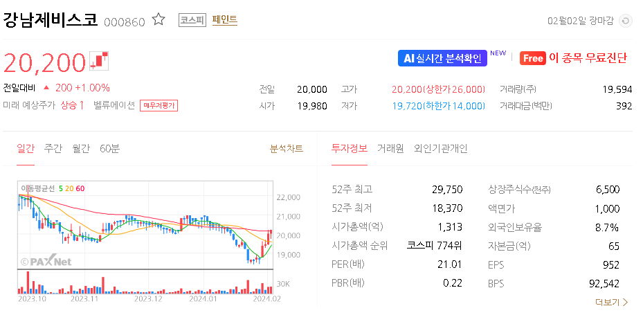 외국인 보유 비중은 8.70% 이며 장중 거래량은 19,366원 을 기록했습니다. 매출액은 4,793억 원을 달성했습니다. EPS는 없음원이며 강남제비스코 주식 배당수익률은 1.23% 입니다.
