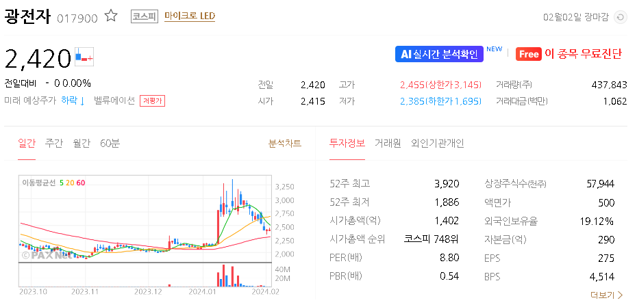 외국인 보유 비중은 19.12% 이며 장중 거래량은 635,487원 을 기록했습니다. 매출액은 976억 원을 달성했습니다. EPS는 없음원이며 광전자 주식 배당수익률은 1.74% 입니다.