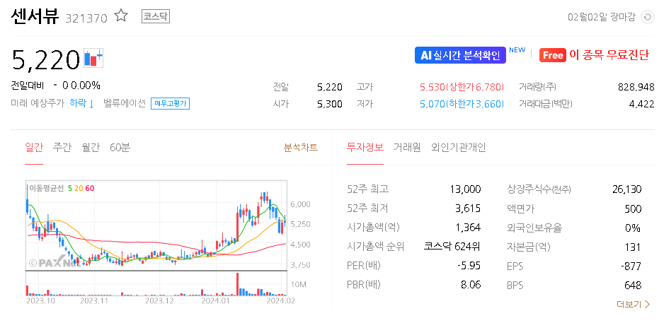 이 글에서는 센서뷰 주가 전망과 목표 주가, 기업 정보에 대해서 설명합니다. 주식 시장에서 중요한 것은 미래의 기업 가치를 예측하고 선제적으로 움직이는 것입니다. 투자할 종목을 고르기 전에 현재 기업의 현황과 데이터를 확인하는 것이 필요합니다. 센서뷰 주식의 주요 현황과 투자 정보를 확인하시고 주식 투자에 도움이 되는 정보들을 모아 제공하니 투자에 도움을 받으실 수 있을 것입니다.