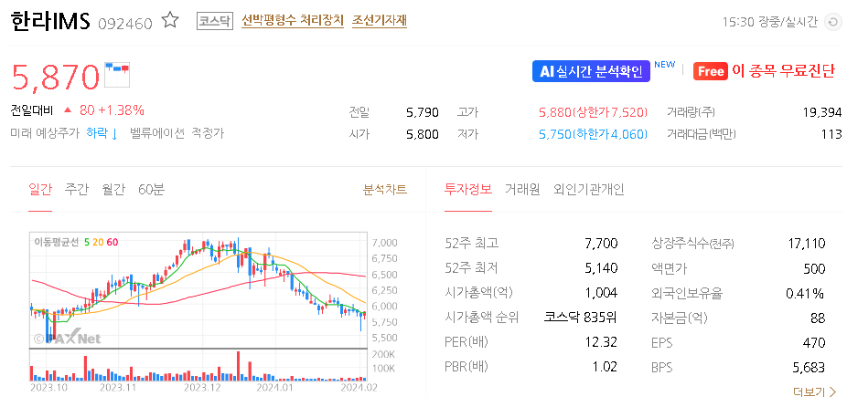 한라IMS 현재 주가는 5,870원이며 전일 대비 -10.24원의 모습을 보이고 있습니다. 한라IMS의 주주현황을 살펴보면 지석준 주주가 전체 지분 58.77%를 소유하고 있습니다. 한라IMS는 조선 기업으로 장중 기준으로 주가는 5,870원 입니다. 한라IMS의 시가 총액은 1004억 원이며 발행 주식수는 17,109,680주 입니다. 외국인 보유 비중은 0.39% 이며 장중 거래량은 19,399원 을 기록했습니다. 매출액은 598억 원을 달성했습니다. EPS는 없음원이며 한라IMS 주식 배당수익률은 % 입니다.