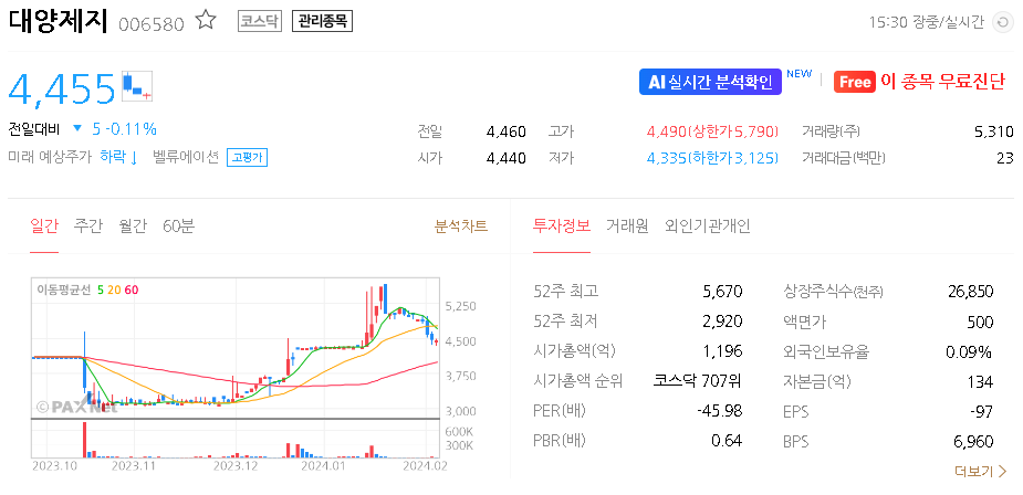 대양제지 주가 분석