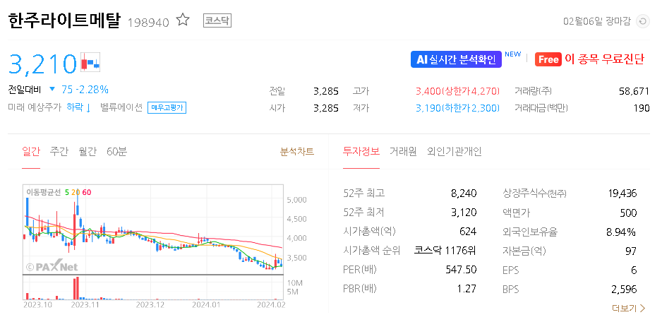 한주라이트메탈 주가 분석