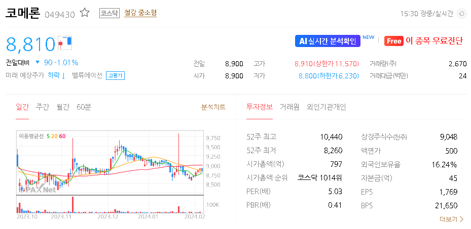 이 글에서는 코메론 주가 전망과 목표 주가, 기업 정보에 대해서 설명합니다. 주식 거래에서 중요한 부분은 현재 기업 가치보다는 미래의 기업 가치를 예측하고 먼저 행동하는 것입니다. 투자할 종목을 고르기 전에 현재 기업의 상황과 지표를 살펴보는 것이 중요합니다. 코메론 주식의 주요 현황과 투자 정보를 확인하시고 주식 투자에 도움을 줄 자료들을 모아 두었으니 투자에 도움을 받으시길 바랍니다.