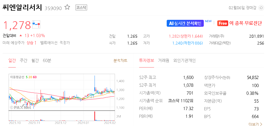 씨엔알리서치 가치 분석