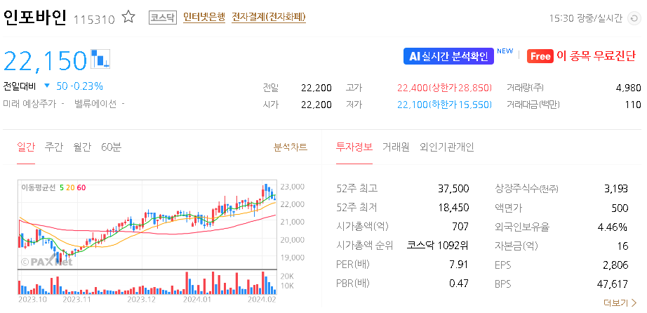 인포바인 현재 주가는 22,600원이며 전일 대비 -50원의 모습을 보이고 있습니다. 인포바인의 주주현황을 살펴보면 자사주 주주가 전체 지분 22.70%를 소유하고 있습니다. 인포바인는 인터넷 서비스 기업으로 장중 기준으로 주가는 22,600원 입니다. 인포바인의 시가 총액은 709억 원이며 발행 주식수는 3,192,883주 입니다. 외국인 보유 비중은 4.52% 이며 장중 거래량은 12,861원 을 기록했습니다. 매출액은 168억 원을 달성했습니다. EPS는 없음원이며 인포바인 주식 배당수익률은 64% 입니다.