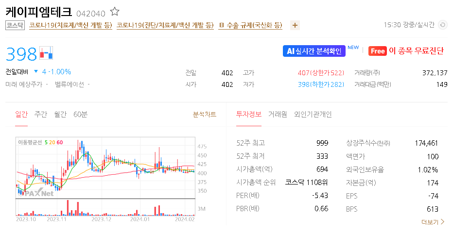 케이피엠테크 현재 주가는 403원이며 전일 대비 -0.74원의 모습을 보이고 있습니다. 케이피엠테크의 주주현황을 살펴보면 텔콘RF제약 주주가 전체 지분 22.81%를 소유하고 있습니다. 케이피엠테크는 화학 기업으로 장중 기준으로 주가는 403원 입니다. 케이피엠테크의 시가 총액은 701억 원이며 발행 주식수는 174,460,917주 입니다. 외국인 보유 비중은 1.03% 이며 장중 거래량은 305,972원 을 기록했습니다. 매출액은 324억 원을 달성했습니다. EPS는 없음원이며 케이피엠테크 주식 배당수익률은 % 입니다.