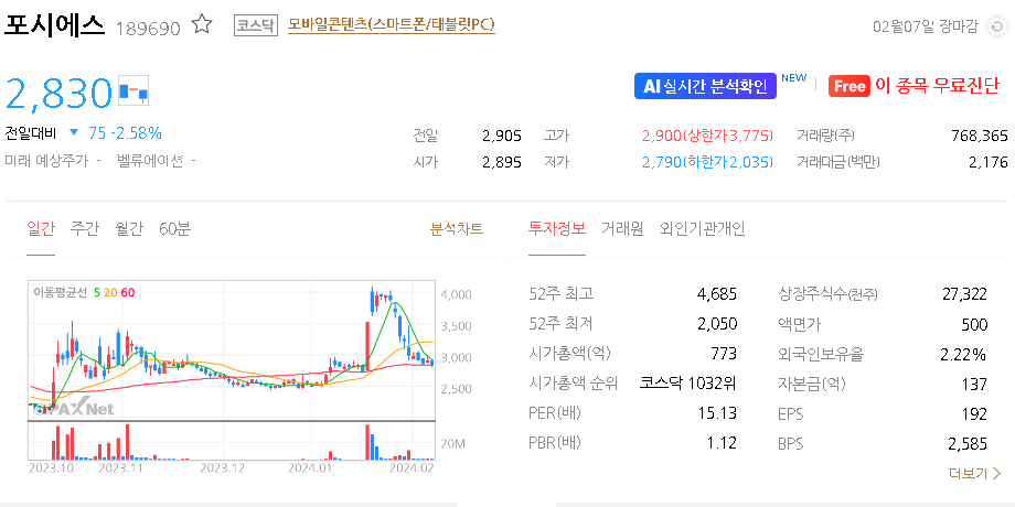 포시에스 현재 주가는 2,835원이며 전일 대비 -70원의 모습을 보이고 있습니다. 포시에스의 주주현황을 살펴보면 조종민 주주가 전체 지분 51.69%를 소유하고 있습니다. 포시에스는 일반 소프트웨어 기업으로 장중 기준으로 주가는 2,835원 입니다. 포시에스의 시가 총액은 794억 원이며 발행 주식수는 27,321,969주 입니다. 외국인 보유 비중은 3.09% 이며 장중 거래량은 892,674원 을 기록했습니다. 매출액은 72억 원을 달성했습니다. EPS는 없음원이며 포시에스 주식 배당수익률은 % 입니다.