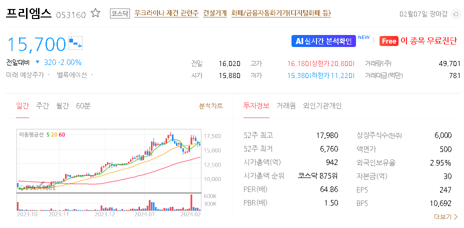 이 글에서는 프리엠스 주가 전망과 목표 주가, 기업 정보에 대해서 설명합니다. 주식 거래에서 중요한 부분은 현재 기업 가치보다는 미래의 기업 가치를 예측하고 먼저 행동하는 것입니다. 투자할 종목을 고르기 전에 현재 기업의 상황과 지표를 살펴보는 것이 중요합니다. 프리엠스 주식의 주요 현황과 투자 정보를 확인하시고 주식 투자에 도움이 될 만한 정보들을 모아 놓았으니 투자를 고려하실 때 참고하세요.