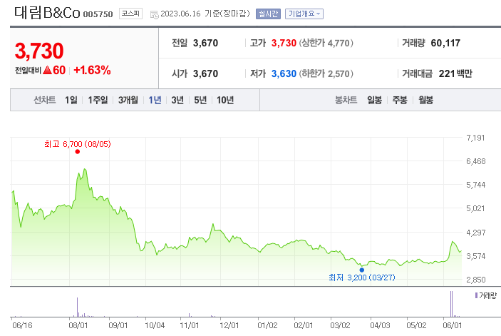 외국인 보유 비중은 278,137%이며 장중 거래량은 16,672,240를 기록했습니다. 매출액은 517억 원, 영업이익은 15억 원을 달성했습니다. EPS는 없음원이며 대림 B&Co 주식 배당수익률은 -0.45%입니다.