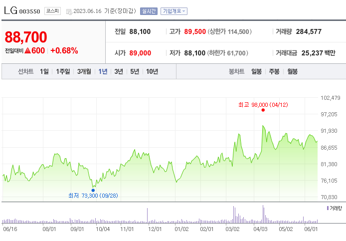 이 글에서는 LG 주가 전망과 목표 주가, 기업 정보에 대해서 설명합니다. 주식을 알아보기 전에 기업의 현재 주가와 재무 상태에 관해서 정리해 보는 것은 아주 중요합니다. LG 주식의 주요 현황과 투자 정보를 확인하시고 현재 시장 흐름을 알아보겠습니다.