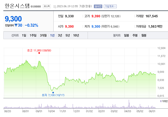한온시스템 현재 주가는 9,320원이며 전일 대비 -50원의 모습을 보이고 있습니다. 한온시스템의 주주현황을 살펴보면 한앤코오토홀딩스(외 1인)가 지분 69.99%를 소유하고 있습니다. 한온시스템은 자동차부품 기업으로 장중 기준으로 주가는 9,320원입니다. 한온시스템의 시가 총액은 4조 9804억 원이며 발행 주식수는 16.69주입니다.