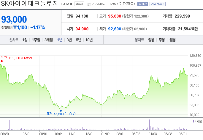 SK아이이테크놀로지의 시가 총액은 6조 7091억 원이며 발행 주식수는 7.51주입니다. 외국인 보유 비중은 637,793%이며 장중 거래량은 71,297,592를 기록했습니다. 매출액은 1,430억 원, 영업이익은 -523억 원을 달성했습니다. EPS는 268원이며 SK아이이테크놀로지 주식 배당수익률은 2.22%입니다.