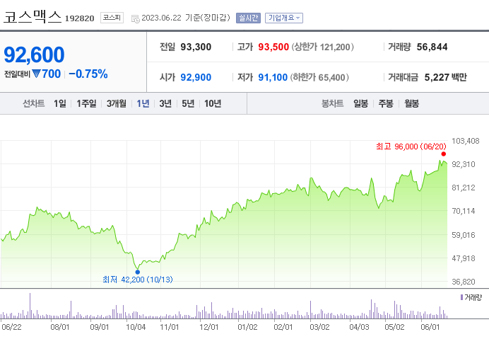 코스맥스 현재 주가는 93,300원이며 전일 대비 -400원의 모습을 보이고 있습니다. 코스맥스의 주주현황을 살펴보면 코스맥스비티아이(외 17인)이 지분 26.27%를 소유하고 있습니다. 코스맥스는 개인생활용품 기업으로 장중 기준으로 주가는 93,300원 입니다. 코스맥스의 시가 총액은 1조510억 원이며 발행 주식수는 24.55주 입니다.