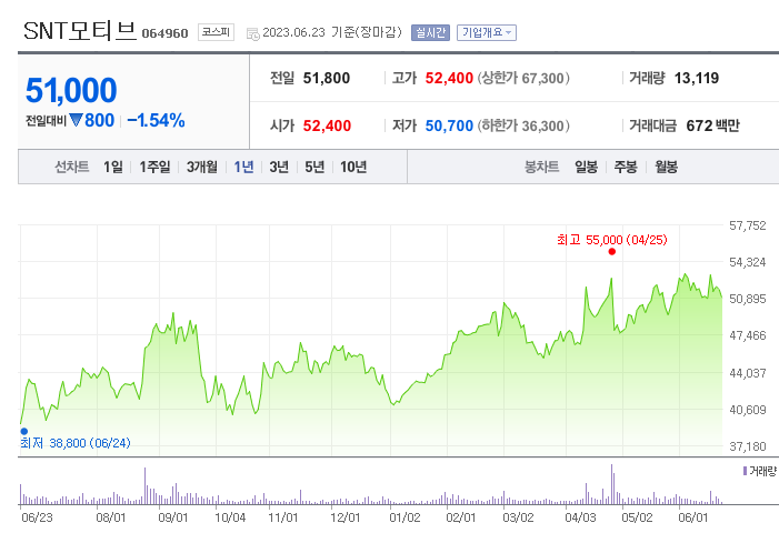 SNT모티브 현재 주가는 52,000원이며 전일 대비 -0.38원의 모습을 보이고 있습니다. SNT모티브의 주주현황을 살펴보면 S&T홀딩스(외 1인)이 지분 41.10%를 소유하고 있습니다. SNT모티브는 자동차부품 기업으로 장중 기준으로 주가는 52,000원 입니다. SNT모티브의 시가 총액은 7575억 원이며 발행 주식수는 19.87주 입니다.