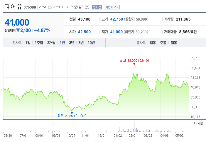 디어유 현재 주가는 41,000원이며 전일 대비 -2,100원의 모습을 보이고 있습니다. 디어유의 주주현황을 살펴보면 에스엠스튜디오스(외 3인)이 지분 35.43%를 소유하고 있습니다. 디어유는 인터넷 서비스 기업으로 장중 기준으로 주가는 41,000원입니다. 디어유의 시가 총액은 9725억 원이며 발행 주식수는 3.11주입니다.