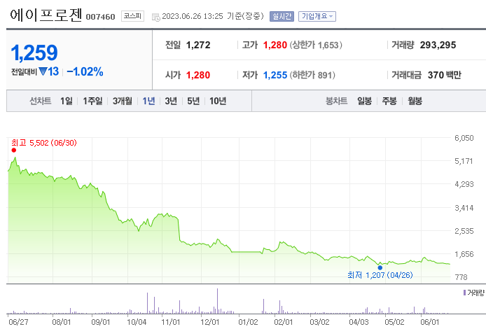 외국인 보유 비중은 391,615% 이며 장중 거래량은 253,668,855를 기록했습니다. 매출액은 360억 원, 영업이익은 -1,193억 원을 달성했습니다. EPS는 없음원이며 에이프로젠 주식 배당수익률은 1.14% 입니다.