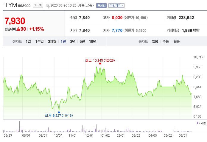 외국인 보유 비중은 459,398% 이며 장중 거래량은 45,050,956를 기록했습니다. 매출액은 2,361억 원, 영업이익은 1,220억 원을 달성했습니다. EPS는 없음원이며 TYM 주식 배당수익률은 3,627% 입니다.