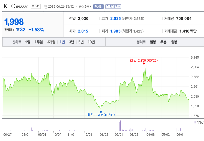 KEC 현재 주가는 2,025원이며 전일 대비 -25원의 모습을 보이고 있습니다. KEC의 주주현황을 살펴보면 한국전자홀딩스(외 8인)이 지분 31.29%를 소유하고 있습니다. KEC는 반도체 및 관련장비 기업으로 장중 기준으로 주가는 2,025원 입니다. KEC의 시가 총액은 2939억 원이며 발행 주식수는 2.30주 입니다.