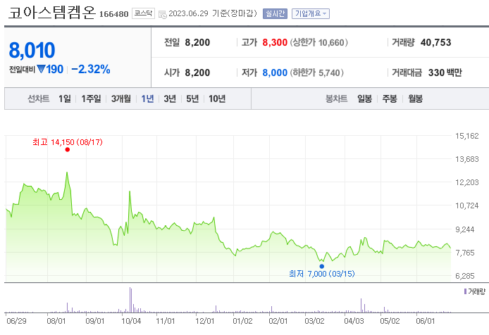 외국인 보유 비중은 61,687% 이며 장중 거래량은 32,870,376를 기록했습니다. 매출액은 123억 원, 영업이익은 -60억 원을 달성했습니다. EPS는 없음원이며 코아스템켐온 주식 배당수익률은 3.31% 입니다.