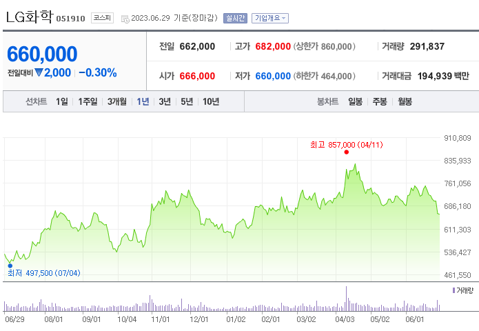 LG화학 현재 주가는 703,000원이며 전일 대비 -0.42원의 모습을 보이고 있습니다. LG화학의 주주현황을 살펴보면 LG(외 2인)이 지분 33.37%를 소유하고 있습니다. LG화학는 화학 기업으로 장중 기준으로 주가는 703,000원 입니다. LG화학의 시가 총액은 46조7321억 원이며 발행 주식수는 47.61주 입니다.