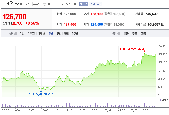 LG전자 현재 주가는 123,000원이며 전일 대비 -500원의 모습을 보이고 있습니다. LG전자의 주주현황을 살펴보면 LG(외 2인)이 지분 33.68%를 소유하고 있습니다. LG전자는 내구소비재 기업으로 장중 기준으로 주가는 123,000원 입니다. LG전자의 시가 총액은 20조960억 원이며 발행 주식수는 29.99주 입니다.