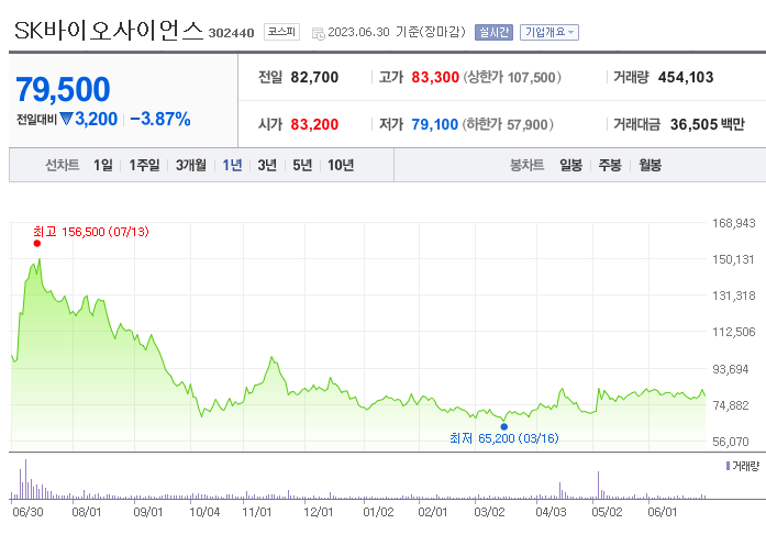 SK바이오사이언스 현재 주가는 78,200원이며 전일 대비 -500원의 모습을 보이고 있습니다. SK바이오사이언스의 주주현황을 살펴보면 에스케이케미칼(외 2인)이 지분 68.24%를 소유하고 있습니다. SK바이오사이언스는 제약 기업으로 장중 기준으로 주가는 78,200원 입니다. SK바이오사이언스의 시가 총액은 6조967억 원이며 발행 주식수는 4.68주 입니다.