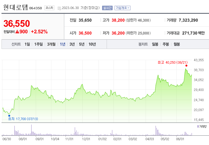 현대로템 현재 주가는 36,700원이며 전일 대비 -350원의 모습을 보이고 있습니다. 현대로템의 주주현황을 살펴보면 현대자동차(외 3인)이 지분 33.77%를 소유하고 있습니다. 현대로템는 운송인프라 기업으로 장중 기준으로 주가는 36,700원 입니다. 현대로템의 시가 총액은 3조9018억 원이며 발행 주식수는 18.72주 입니다.