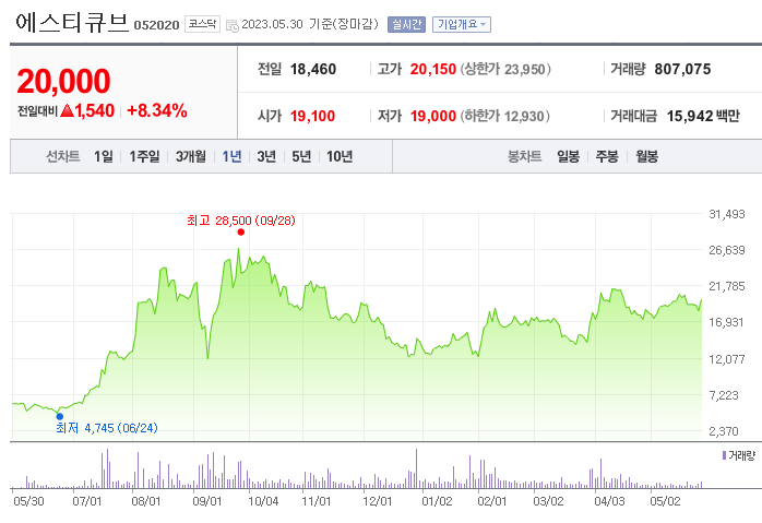 외국인 보유 비중은 570,956%이며 장중 거래량은 46,278,501를 기록했습니다. 매출액은 63억 원, 영업이익은 -190억 원을 달성했습니다. EPS는 없음원이며 에스티큐브 주식 배당수익률은 -131%입니다.