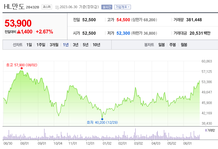 HL만도 현재 주가는 52,500원이며 전일 대비 -600원의 모습을 보이고 있습니다. HL만도의 주주현황을 살펴보면 한라홀딩스(외 3인)이 지분 30.26%를 소유하고 있습니다. HL만도는 자동차부품 기업으로 장중 기준으로 주가는 52,500원 입니다. HL만도의 시가 총액은 2조5310억 원이며 발행 주식수는 25.28주 입니다.